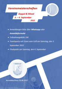 Diese finden in diesem Jahr am 3. & 4. September auf unserer Anlage statt. Hier wird es am Samstag Abend eine Tennisparty mit Essen vom Grill geben.
