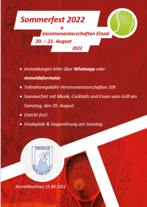Parallel dazu werden unsere Einzel Vereinsmeisterschaften stattfinden. Die Flyer und Anmeldungen werdet ihr demnächst auch auf dem Tennisplatz und auf unserer Homepage sehen können.